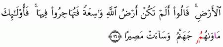 إ ن ال ذ ين ت و ف اه م ال م ل ائ ك ة ظ ال م ي أ ن ف س ه م ق ال وا ف يم ك ن ت م ق ال وا ك ن ا م س ت ض ع ف ين ف ي ال أ ر ض ق ال وا أ ل م ت ك ن أ ر ض الل ه و اس ع ة ف ت ه اج ر وا ف يه ا ف أ ول ئ ك م أ و اه م ج ه ن م و س اء ت