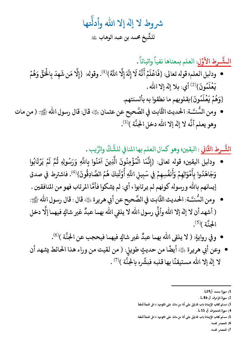 متن شروط لا إله إلا الله وأدلتها الشيخ محمد بن عبد الوهاب التميمي