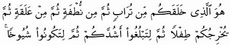 ه و ال ذ ي خ ل ق ك م م ن ت ر اب ث م م ن ن ط ف ة ث م م ن ع ل ق ة ث م ي خ ر ج ك م ط ف ل ا ث م ل ت ب ل غ وا أ ش د ك م ث م ل ت ك ون وا ش ي وخ ا و م ن ك م م ن ي ت و ف ى م ن ق ب ل و ل ت ب ل غ وا أ ج ل ا م س م ى و ل ع ل ك م